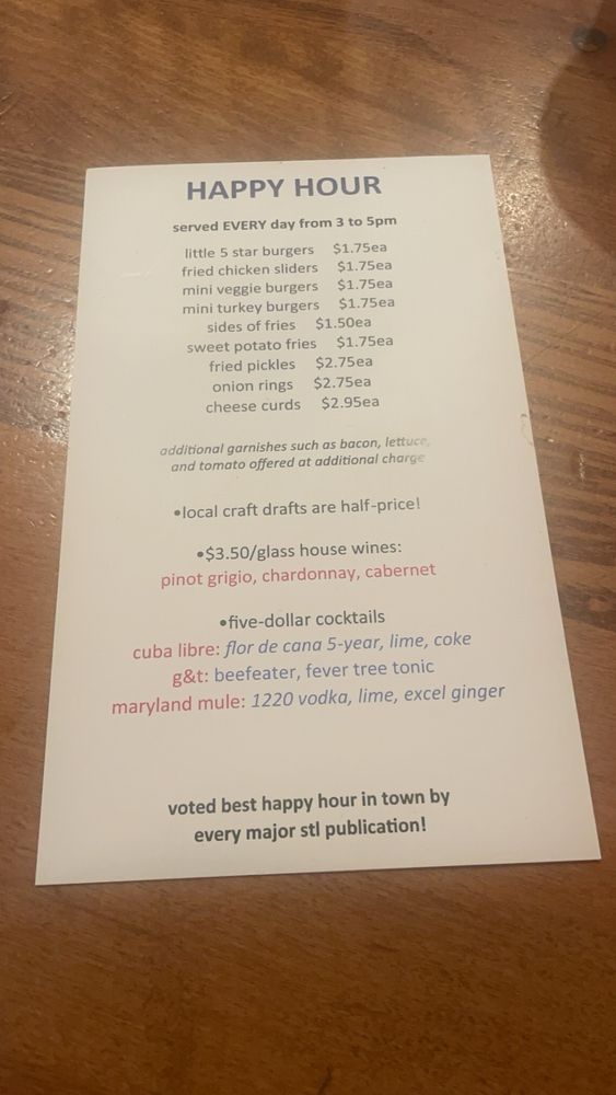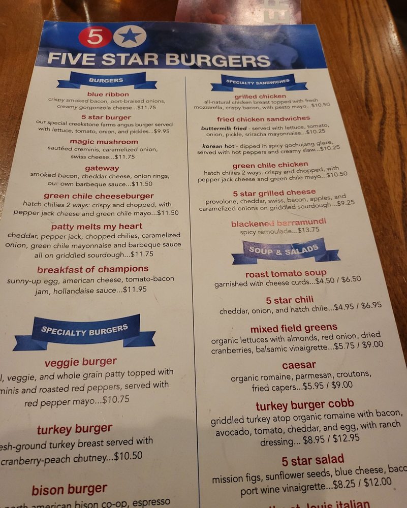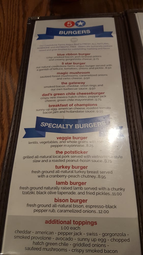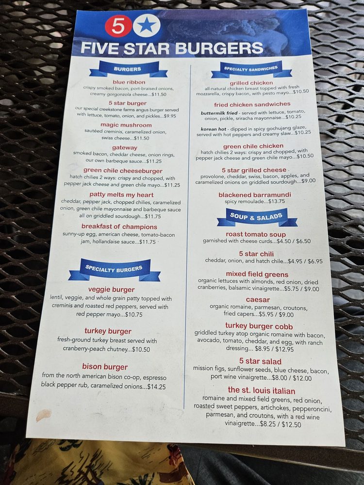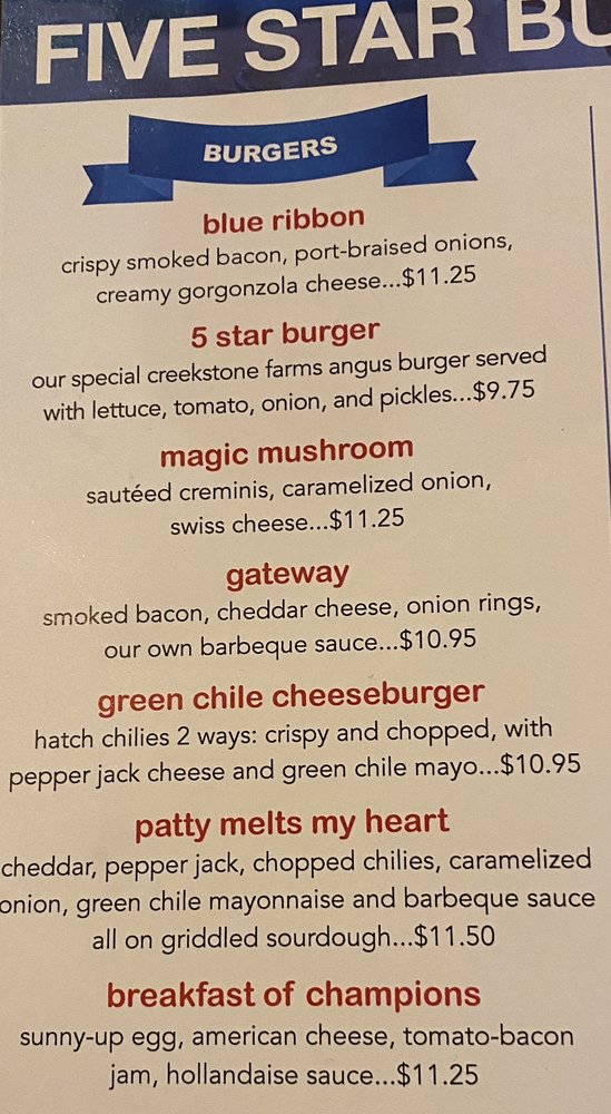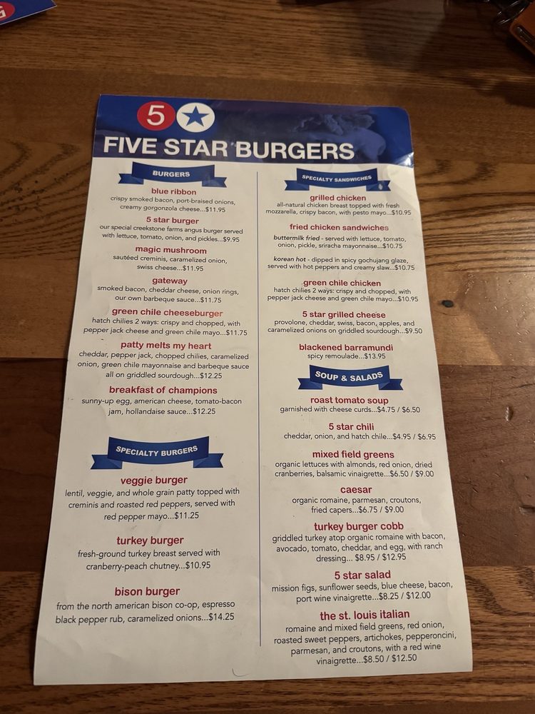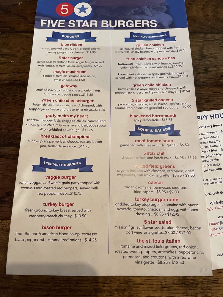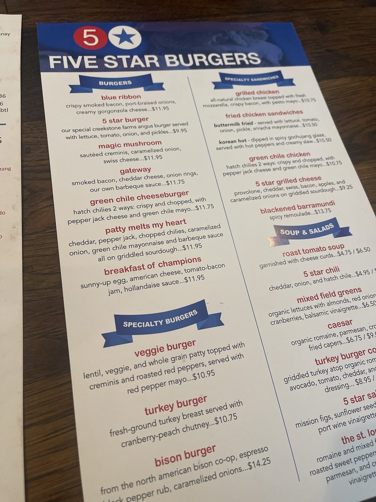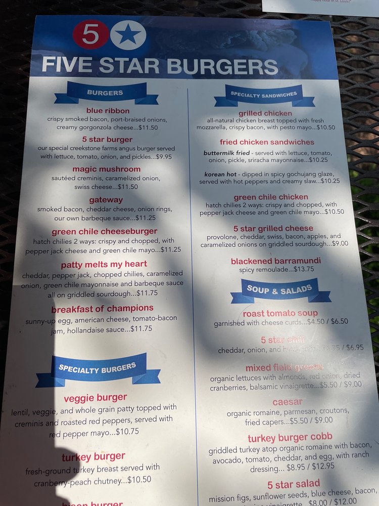 5 Star Burgers, located in Clayton, MO, offers a diverse menu for burger enthusiasts. With options ranging from the Blue Ribbon Burger with gorgonzola cheese to the Magic Mushroom Burger with Swiss cheese, there is something for every taste. Customers praise the delicious food and friendly service, making it a must-visit spot for lunch or dinner. The restaurant also caters to various dietary preferences, with vegan and vegetarian options available. Notable items include the Five Star Burger and sweet potato fries with aioli, creating a satisfying dining experience. The outdoor seating, full bar, and happy hour specials add to the overall ambiance, making it a great choice for groups or families. Stop by 5 Star Burgers for a flavorful meal and enjoy the relaxed atmosphere.